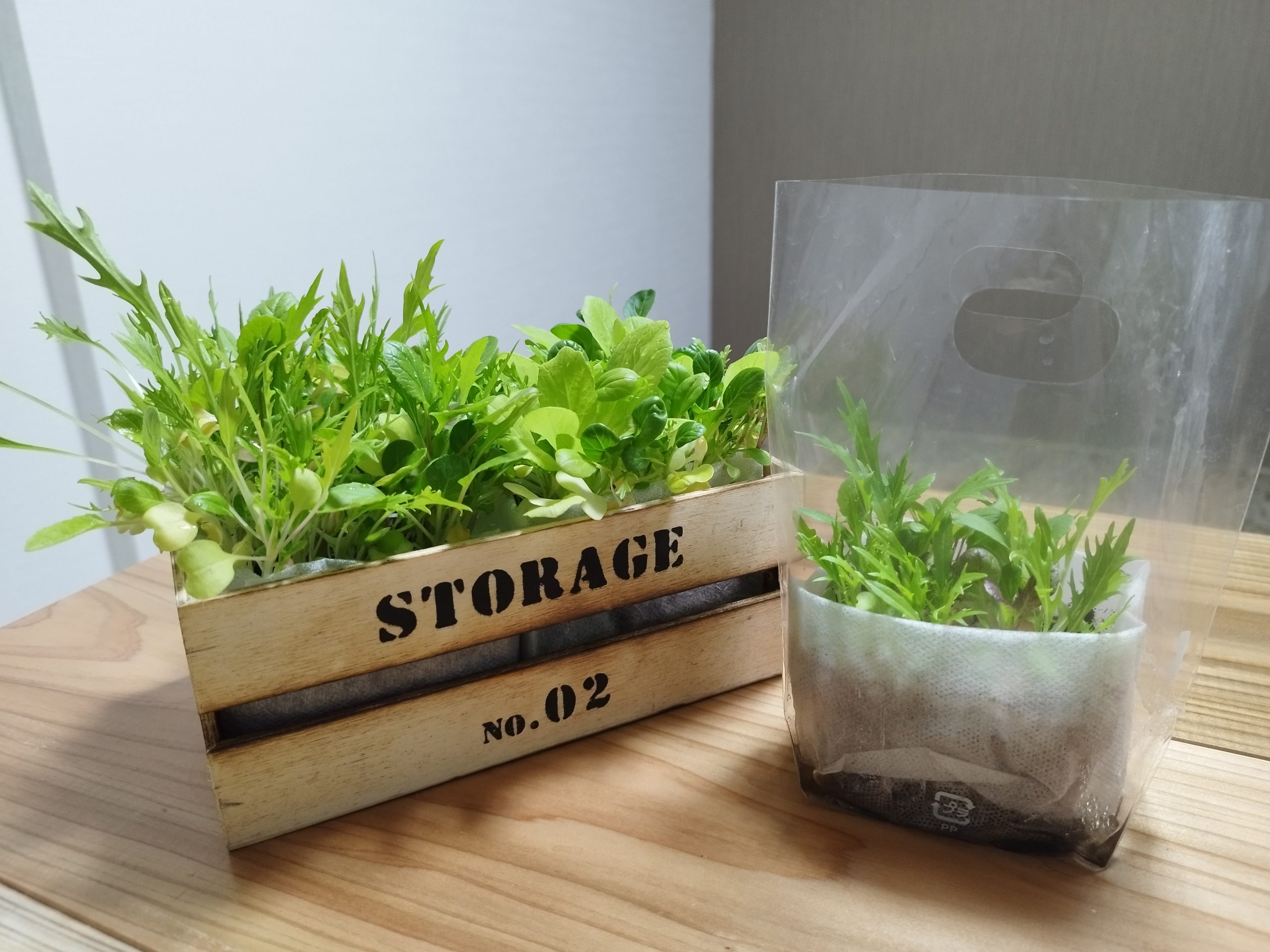 ご存じの方も多いと思いますが、ベビーリーフというのは品種ではなく、小松菜や水菜、リーフレタスなど様々な葉野菜の若い葉の総称です。10日目~30日くらいのものが多いようです。ベビーリーフとして育てる他、葉野菜を育てる過程で間引きしたものをベビーリーフとして食べることもあります。