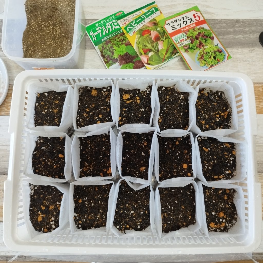 からです。ホームセンターで売られている野菜の苗のように、育苗ポット(一時利用のためのポリエチレン製の薄手の鉢)を使う方法もありましたが、収穫が終わったら処分してしまうことを考えると、少々もったいないしエコではない気がしました。