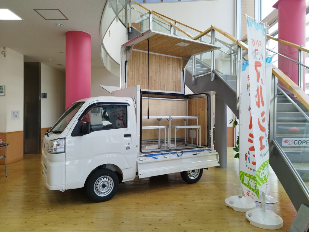 これです。ダイハツが提供している移動販売専用車のレンタルサービスです。今回ダイハツのお店のカウンター前にこの移動販売車を設置して、そこで活き野菜を展示・販売させてもらえることになったのです。来店してくれた人たちも口々に「よくできてる!」「仕事関連で何かに使ってみたい」と言っていましたが、実際、マルシェ出店や移動販売を初期投資押さえてスタートしたい、あるいはイベントなどの新製品PRブースを目立たせたいということならこの「Nibako」、1日13,200円~と料金も手頃ですごくいいと思います。