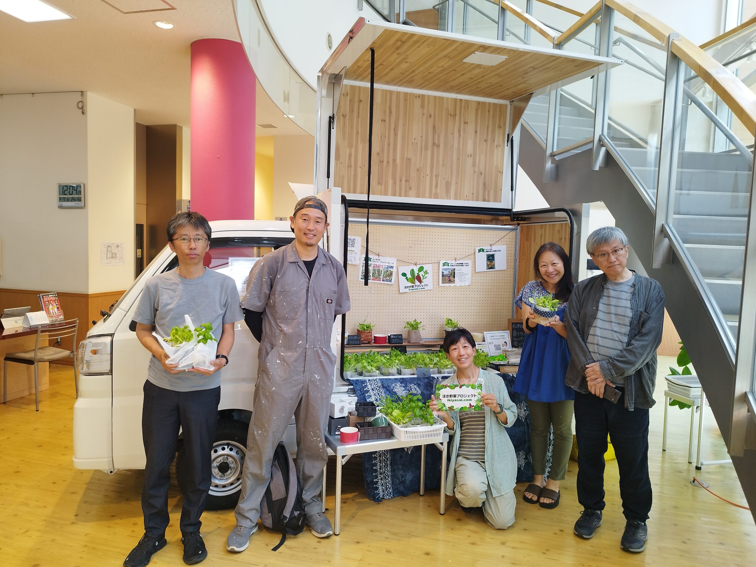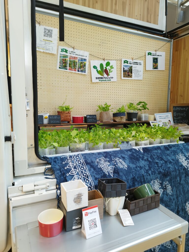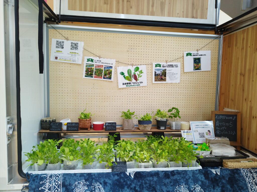 今回は荷台の奥に木の板で棚を作って展示スペースとし、その手前に育苗トレーを並べて活き野菜を陳列しました。また、どの種を使ったのか、どんな培養土で育てているのかなど印刷物をラミネートして、背後のパーテーションに吊るしてみました。